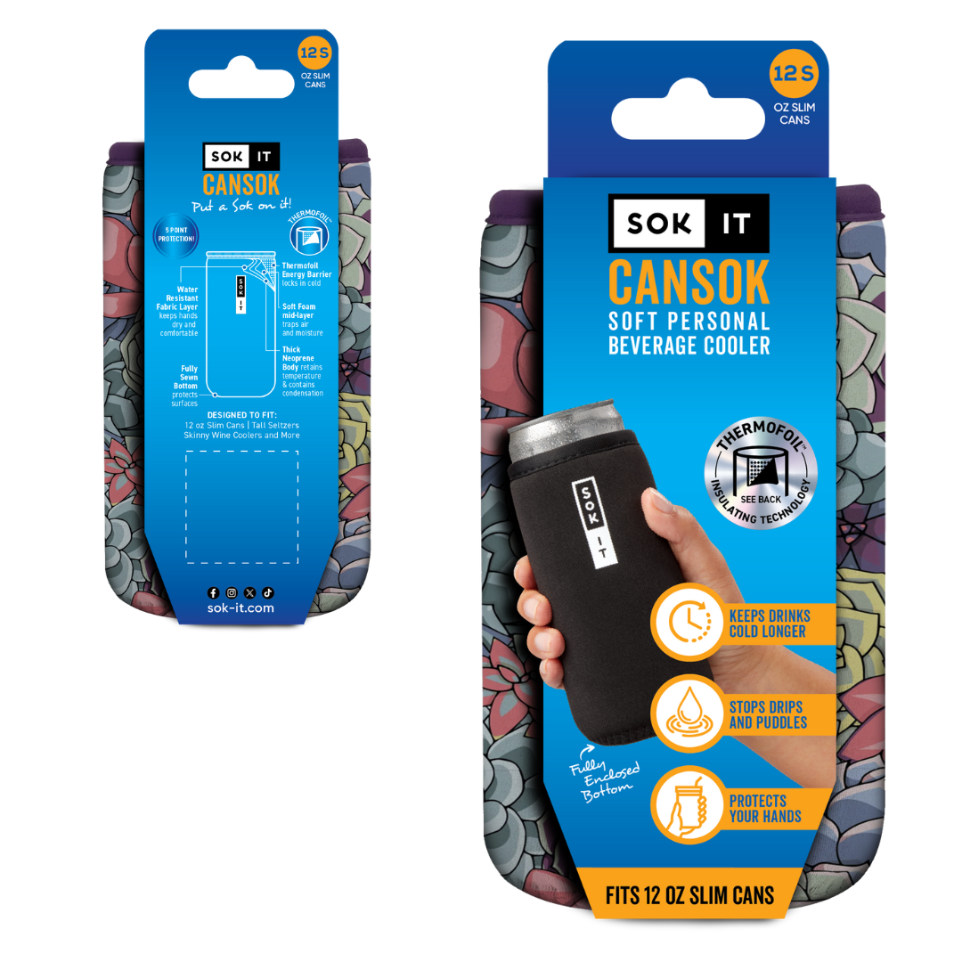 CanSok is a precise fitting, super-insulating Personal Beverage Cooler equipped with our Thermofoil™ protective barrier that keeps drinks cold longer. With a fully enclosed bottom design that stops drips and puddles and always on-trend styles consumers crave, CanSok is a winner that stands out in todays crowded marketplace. CanSok is the new era of personal beverage protection, brought to you by the makers of JavaSok, the best-selling premium Personal Beverage Cooler on the market. Available in a variety of sizes and styles.