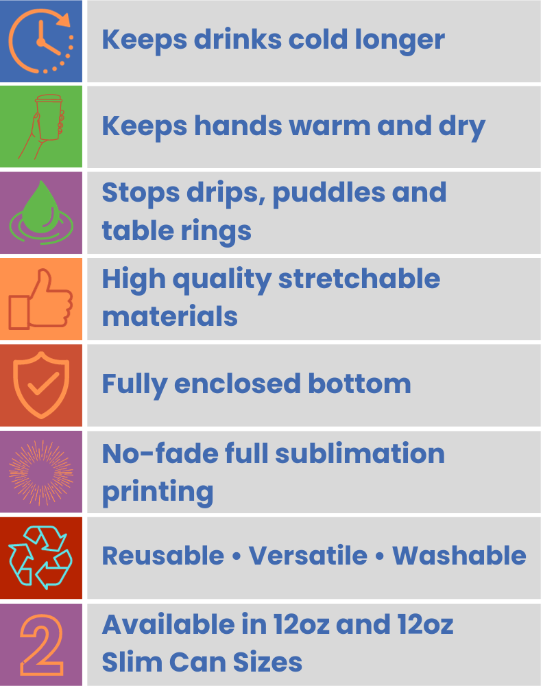 Replace those napkins and disposable cup sleeves with these eco-friendly, reusable beauties and never suffer from wet cold hands or drips and puddles again! Keep drinks cold all day long. Available in a variety of sizes to fit most disposable cold beverage cups.